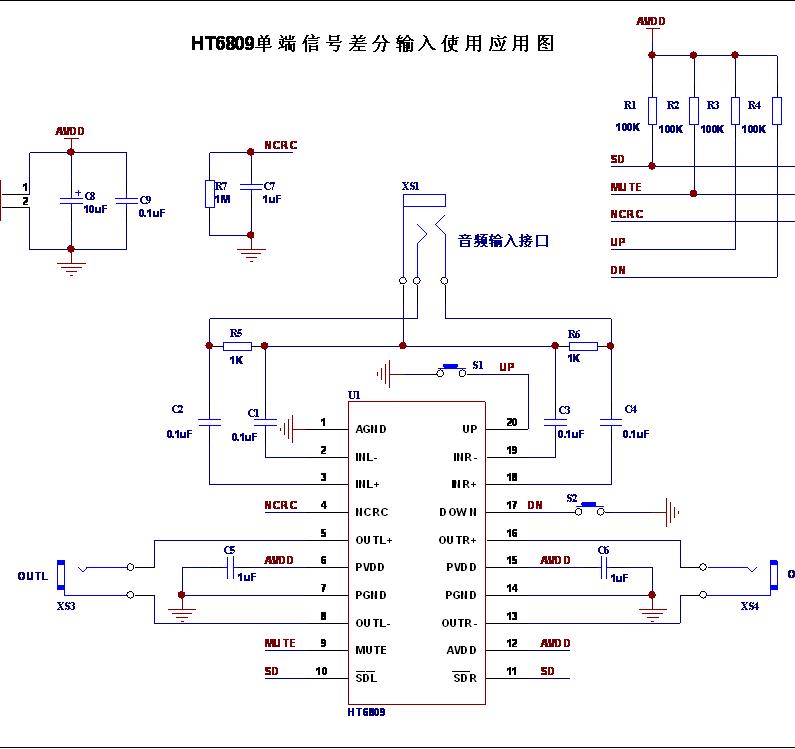 USB音箱使用電腦USB接口供電,同時電腦提供音源時,音箱一般輸出噪聲較大。同樣一款音箱,換用其他電腦的USB或鋰電池供電時輸出噪聲會降低,這個現(xiàn)象在市場上的USB音箱中普遍存在。該現(xiàn)象是由回路噪聲引起的,當(dāng)信號源和電源使用同一個GND時就會出現(xiàn)回路噪聲,使用兩路獨立的電源可以解決這個問題。電腦聲卡本身發(fā)出一定的噪聲,加上電腦整機(jī)系統(tǒng)比較復(fù)雜其GND會受到干擾也會產(chǎn)生噪聲,經(jīng)過功放放大后,噪聲更加明顯。這個噪聲通常市場上普遍應(yīng)用的單端輸入的功放IC都無法避免,但是使用差分輸入的方法在不需使用兩路獨立的電源的情況下是可以解決這個問題。HT6808/HT6809既可以單端輸入,同時也可以使用差分信號做差分輸入使用,通過將單端信號使用差分輸入,從而解決回路噪聲的問題。
