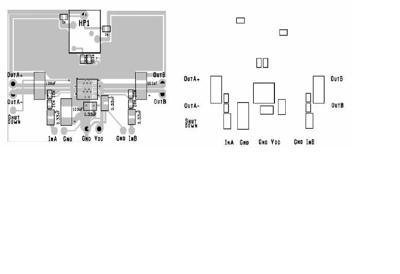 下圖為推薦的20管腳LM4863的MTE封裝形式PCB應用電路板版面及聯(lián)接點布局圖,本電路板適用于5V電源電壓4Ω揚聲器負載的測試、應用電路。這個電路板使用起來很簡單,VDD和GND焊點分別連到5V的電壓和地,兩個4Ω的揚聲器負載分別連在電路板-OUTA和+OUTA焊點、-OUTB和+OUTB焊點之間。