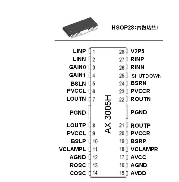 AX3005是一款用于驅(qū)動橋接立體聲揚聲器、每聲道10W的高效D類音頻放大器。它可以驅(qū)動低至8Ω的立體聲揚聲器。當(dāng)播放音樂時,由于AX3005的高效率,因此不需要額外的散熱片。放大器的增益由兩個增益選擇端控制?蛇x的增益包括15.3、21.2、27.2和31.8 dB。電路具有輸出短路保護功能,可防止輸出端到電源、地及其它輸出端的短路。熱保護功能可保證芯片不會超過最大結(jié)溫。本文就其產(chǎn)品特點及應(yīng)用原理進行說明