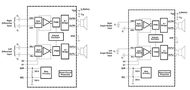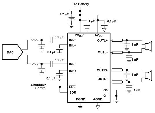 TPA2012D2的每個聲道都可以獨立關(guān)斷控制。使用G0和G1兩個增益選擇的引腳,可選擇6,12,18或24dB的增益。高的PSRR和差分結(jié)構(gòu)提高了它對噪音和RF整流器的抗噪性。除了以上特征外,快速的啟動時間和小的封裝尺寸使得2012成為小型手上設(shè)備和PDA的最佳選擇。