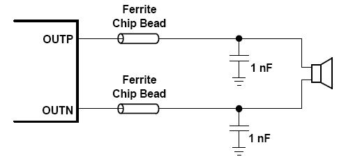 如果電路對于低頻(<1MHz)的電磁干擾比較敏感,或者放大器和喇叭之間有較長的導(dǎo)線,可以使用一個LC輸出濾波器。下圖是典型的磁環(huán)和LC輸出濾波器。