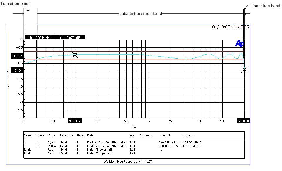 從上圖中我們可以看到整個(gè)測(cè)試結(jié)果的頻段分成二個(gè)部份,一個(gè)是Transition band,另一個(gè)是Outside Transition band,天藍(lán)色的線條代表是信號(hào)的曲線,紅色的部份則是限制范圍,用來表示曲線值正確與否,我們可以看到信號(hào)在高低頻部份開始變的不穏定而且跑出紅線范圍之外,我們稱那是一個(gè)轉(zhuǎn)態(tài)帶(Transition band)的開始,在這項(xiàng)測(cè)試有三個(gè)點(diǎn)要觀察,(1)在Pass band(Outside transition band)內(nèi)是否平順,其漣波值(Ripple)是否在紅線范圍之內(nèi);(2)在Transition band的結(jié)束點(diǎn)是否合乎規(guī)范;(3)信號(hào)進(jìn)入Transition band后是否合乎單一方向性的持續(xù)向外延伸,不能又回到紅線曲域里,業(yè)界稱此為「Monotonic」。