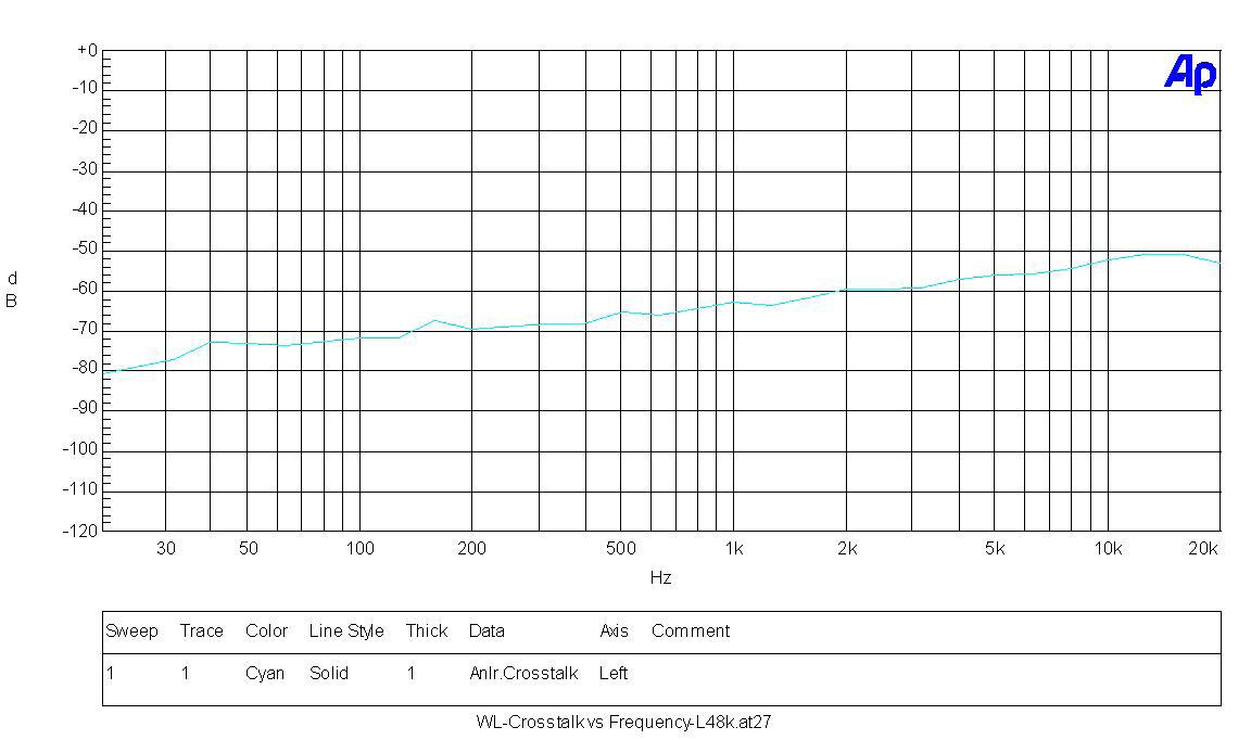 為了此項(xiàng)測(cè)試,我們應(yīng)該準(zhǔn)備二個(gè)不同的Mono檔案,一個(gè)是全頻31階-20dB但只有左聲道,另一個(gè)則只有右聲道,當(dāng)在測(cè)量時(shí),儀器本身的Cross-talk測(cè)試功能會(huì)去檢查有聲音的那個(gè)聲道,和另一個(gè)沒聲音的聲道彼此之間的差異,而取得的比值就是我們要的Cross-talk值。因此本測(cè)試需要跑二次,一次是左聲道對(duì)比上右聲道,另一次則相反。