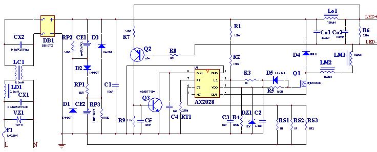 AX2028可設計7W,9W,18WLED 日光燈,可以替代傳統(tǒng)日光燈,本文介紹18W的T8日光燈設計應用,其它功率可類似設計。
