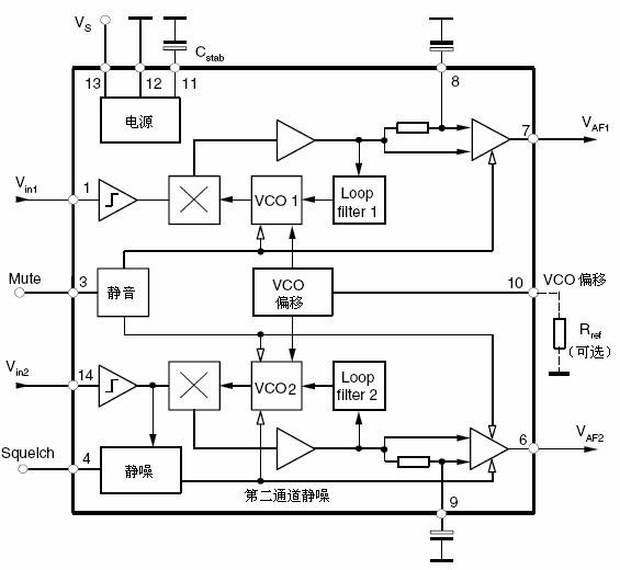 雙通道,免調(diào)試PLL FM 解調(diào)器,能自動鎖定在所接收的伴音載波上;