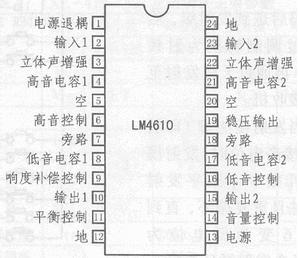 LM4610N/LM4610采用24腳雙列直插式封裝,其引腳及功能如下:2腳和23腳,信號輸人端;3腳和22腳,3D聲場處 理控制端(兩腳通過電容相連,起3D聲場處理作用);4腳和21腳,接高音提升電容(0.01μF);6腳, 高音控制輸人端;8腳和17腳,接低音提升電容(0.39~O.47μF),改變高、低音的電容可改變高、低音 的音調(diào)反應(yīng);10腳和15腳,信號輸入端;11腳,平衡控制輸入端;12腳和24腳,電源地;13腳,正電源端 ;14腳,音量控制輸入端;16腳,低音控制輸人端。