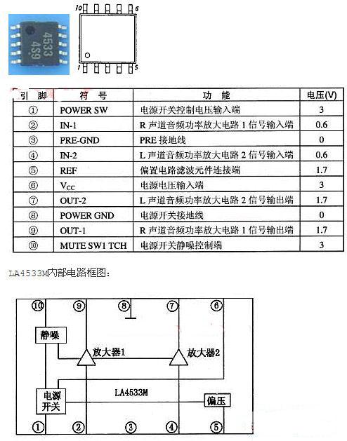 LA4533M集成電路內(nèi)部由兩路功率放大電路,電源通斷靜噪開關(guān)電路、紋波濾波電路等組成。它采用10腳雙列扁平式塑封封裝,其封裝外形和引腳功能如下所示: