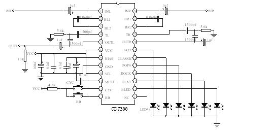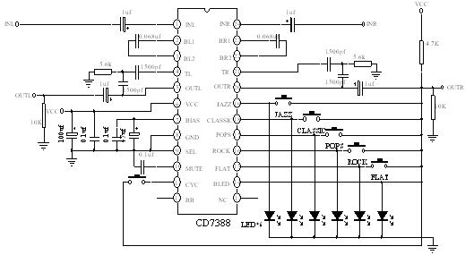 CD7388CP雙通道帶低音提升功能的數(shù)字可預置五種音響效果模式(平坦/普通、搖滾樂、流行音樂、古典音樂和爵士樂)均衡器IC電路特點及應用原理圖介紹