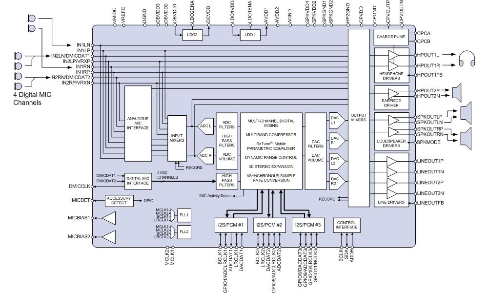 The WM8958 is a highly integrated ultra-low power hi-fi CODEC designed for smartphones and other portable devices rich in multimedia features.