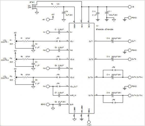 STA543SA帶DC音量控制2.1聲道(24Wx1+7Wx2)CLASS-AB類音頻功率放大器IC電路特點及應(yīng)用原理圖介紹