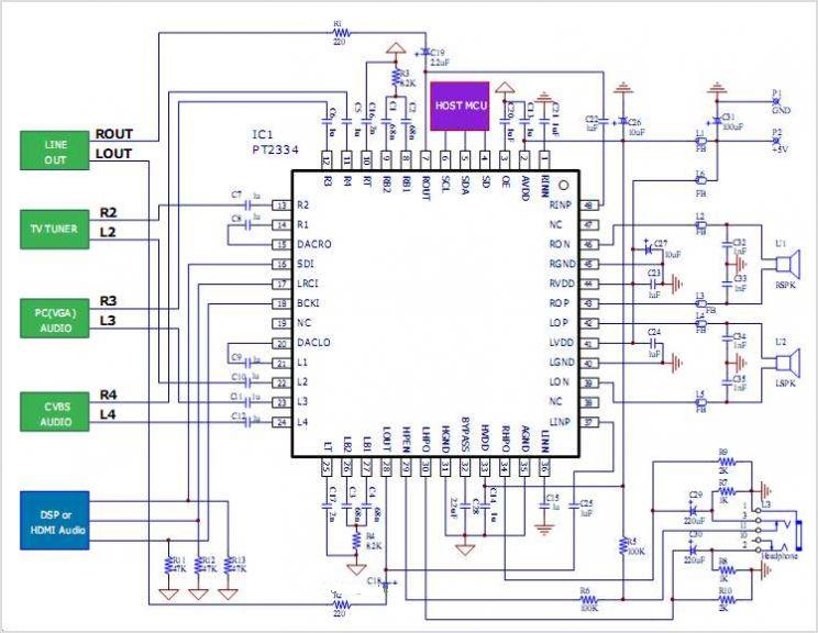 PT2334集成D類放大器/位轉(zhuǎn)比/高音質(zhì)音頻處器/耳機(jī)放大器功能可攜式產(chǎn)品音頻IC電路特點(diǎn)及應(yīng)用原理圖介紹