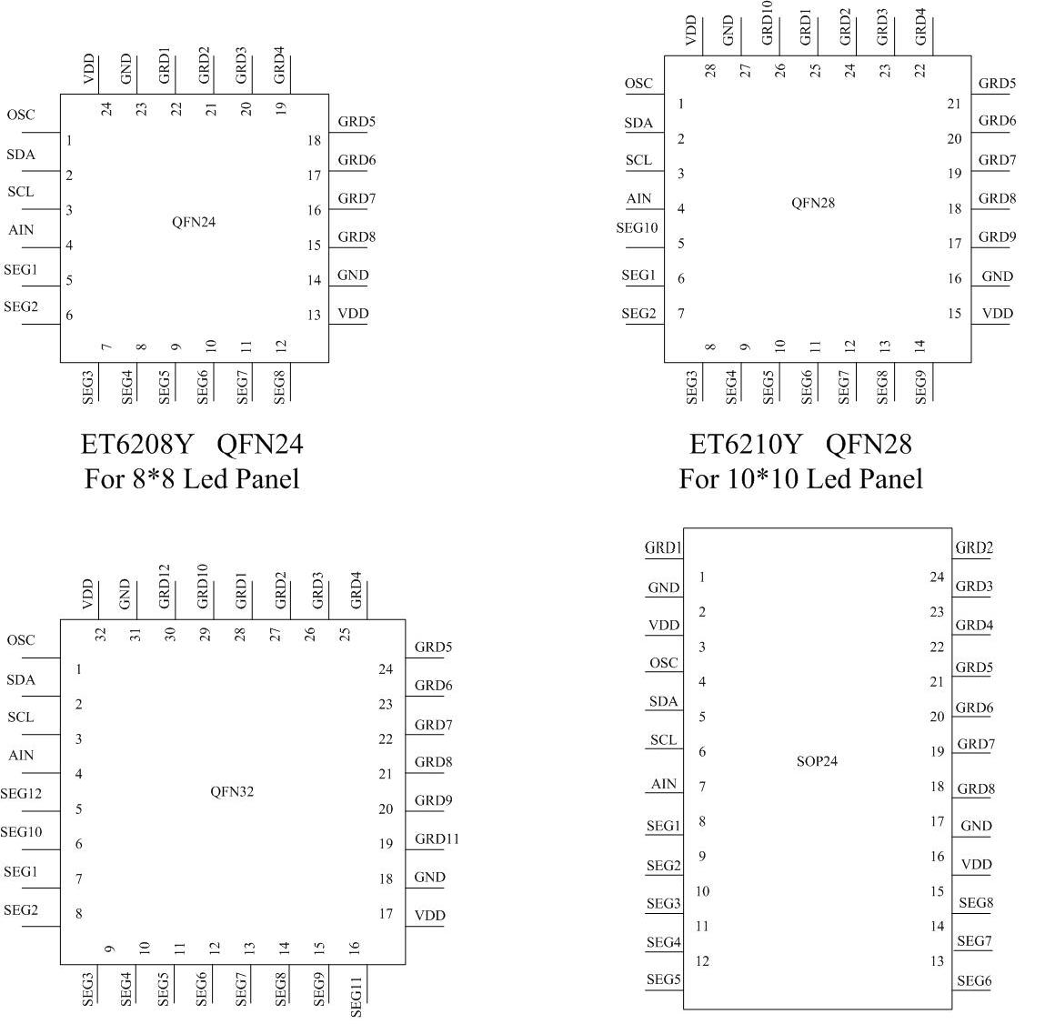 l 封裝形式為QFN24(ET6208Y),QFN28(ET6210Y),QFN32(ET6212)