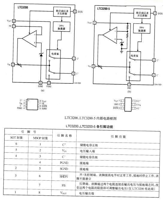LTC3200, LTC3200-5有6引腳SOT和8腳MSOP兩種封裝形式,內(nèi)部電路框圖如圖所示,各引腳功能見下表.