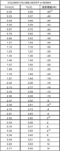 SEDIFF腳調(diào)節(jié)耳機模式的音量。耳機音量大小取決于VOLUME腳、SEDIFF腳的電壓差。例如:當VDD=5V時,VOLUME電壓=2.95V,SEDIFF電壓=1V,則耳機增益為-18dB(具體增益對應的電壓點請查表2)。.此腳對BTL模式無效