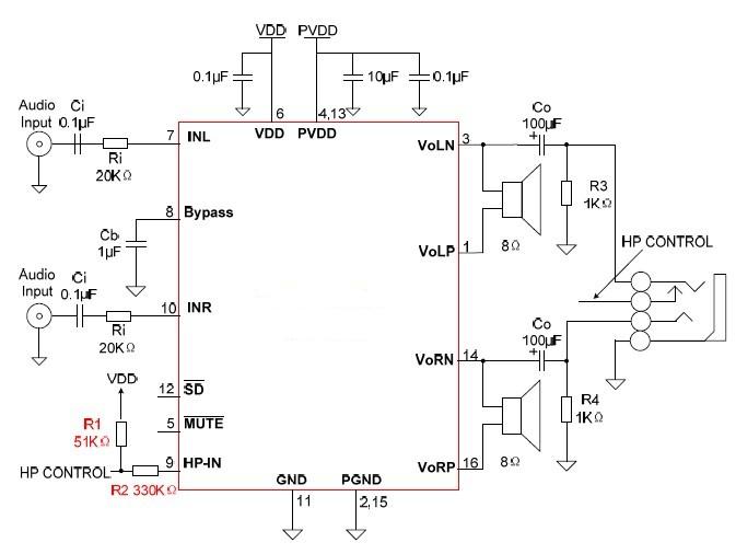 注:切換耳機的控制引腳Pin 9(HP-IN)外接的兩電阻R1,R2推薦值R1=51kΩ, R2=330kΩ;