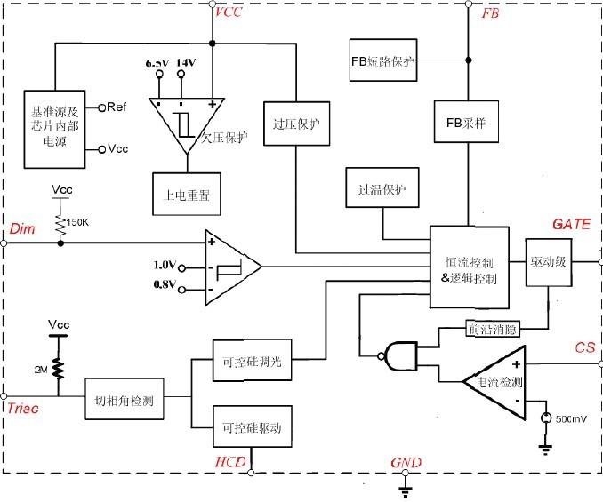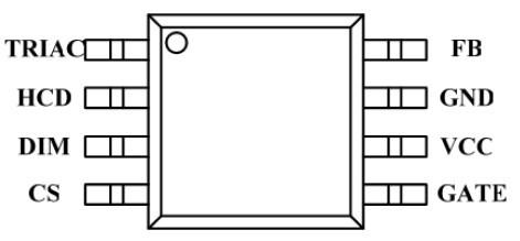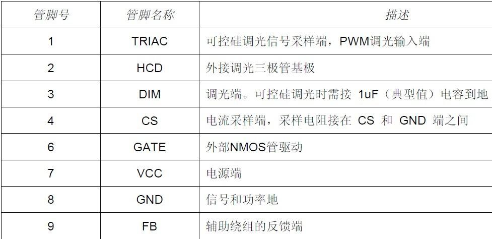 HC3108是一款支持可控硅調(diào)光器的LED恒流控制芯片。適用于輸入全電壓范圍的反激式隔離LED恒流電源。HC3108工作在電感電流斷續(xù)模式,采用原邊反饋模式,無(wú)需次級(jí)反饋電路,也無(wú)需補(bǔ)償電路即可實(shí)現(xiàn)恒流,極大的節(jié)約系統(tǒng)成本和體積。芯片采用了專利的恒流控制方式,可以達(dá)到優(yōu)異的線性調(diào)整率和負(fù)載調(diào)整率。HC3108芯片內(nèi)部集成了可控硅調(diào)光控制電路,外圍僅需要很少的組件就可與芯片配合實(shí)現(xiàn)調(diào)光功能。調(diào)光范圍寬,無(wú)閃爍。HC3108芯片內(nèi)帶有高精度的電流取樣電路,使得LED輸出電流精度達(dá)到±3%以內(nèi)。HC3108具有多重保護(hù)功能,包括LED開路保護(hù)LED短路保護(hù)、芯片過(guò)溫保護(hù),過(guò)壓保護(hù),欠壓保護(hù), FB短路保護(hù)等。HC3108采用SOP-8封裝。