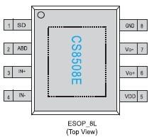 CS8508E提供了纖小的ESOP8L封裝類型供客戶選擇,其額定的工作溫度范圍為-40℃至85℃。