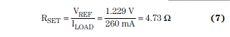 升壓轉(zhuǎn)換器經(jīng)過配置,用于驅(qū)動3支高亮度白光LED(260 mA)。典型參考電壓為1.229 V時,將簡化的負載電流用于方程式7中,計算得到RSET: