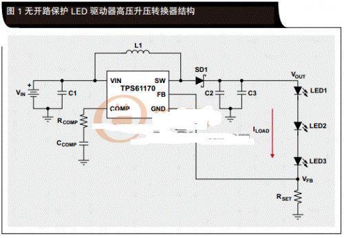 我們常常對轉(zhuǎn)換器進行修改,以在單節(jié)鋰離子(Li-Ion)、堿性及其它應用中驅(qū)動高亮度LED。在這些應用中,LED串的電壓超出了電池或者電源軌電壓。在標準升壓圖1無開路保護LED驅(qū)動器高壓升壓轉(zhuǎn)換器結構配置結構中,利用一個分壓器產(chǎn)生電路的反饋電壓VFB,從而對輸出電壓VOUT進行監(jiān)控。轉(zhuǎn)換器對輸出電壓進行調(diào)節(jié),讓VFB始終都等于片上參考電壓VREF.這種拓撲為自適應型,可用負載代替反饋分壓器中的上層電阻器,從而保持恒定電流而非恒定電壓,如圖1中LED串所示。