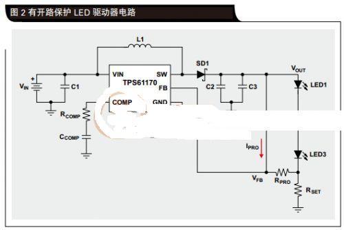 我們?yōu)辇R納二極管選擇一個電壓,以使正常電路工作期間沒有電流流經(jīng)它。為了確保該二極管在正常運行期間圖2有開路保護LED驅(qū)動器電路完全關閉,所選電壓應至少高于最大負載電壓2V,但小于升壓轉(zhuǎn)換器的規(guī)定最大輸出電壓。這樣,電路設計人員便不會經(jīng)常被迫增加輸出電容器C2和C3以及箝位二極管SD1的額定電壓。