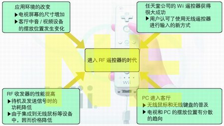首先,客廳中電視的使用狀況發(fā)生了變化;其次,任天堂公司的家庭游戲機Wii所采用的RF遙控器獲得了很大成功;再次,可以聯(lián)網(wǎng)的電視逐漸普及,市場對于鼠標(biāo)或鍵盤等輸入設(shè)備的需求量增加;最后,用于RF遙控器的無線收發(fā)器的性能迅速提升。這些變化導(dǎo)致RF遙控器走向?qū)嵱谩?/font>