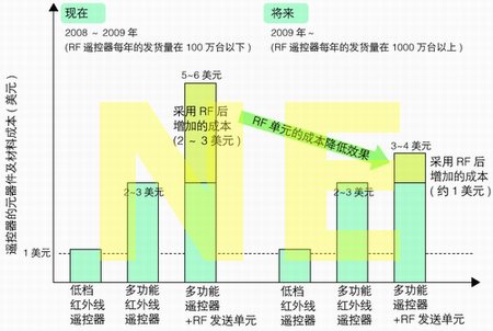 但是,目前還不會發(fā)生RF遙控器迅速取代所有紅外線遙控器的狀況。首先會被取代的將是一部分高檔電視中使用的多功能遙控器。最初,這些RF遙控器的發(fā)貨量每年大約只有100萬臺。遙控器的全球市場規(guī)模約是5億~6億臺,這部分最先采用的RF遙控器還不足1%。