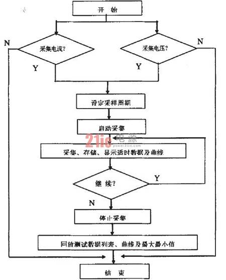 在圖5所示的面板圖中,設(shè)置兩個(gè)開關(guān)以選擇是監(jiān)測(cè)電流、電壓還是同時(shí)監(jiān)測(cè)。分別顯示電流實(shí)時(shí)采集曲線和電壓實(shí)時(shí)采集曲線,并配以數(shù)字顯示。在采集周期設(shè)置窗口,以秒為單位設(shè)置采樣周期。"開始采集"按鈕同時(shí)具有暫停功能。全部采集結(jié)束后,選擇"退出并回放"按鈕,在回放波形窗將顯示采集電流波形,并計(jì)算其曲線下面積值作為電流充放電的安時(shí)數(shù)(能量值)。在面板的右下方同時(shí)顯示帶有日期、時(shí)間信息的全部數(shù)據(jù)列表,并顯示電流、電壓最大最小值。