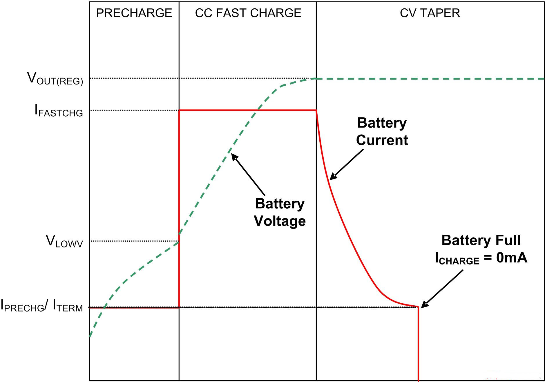 鋰離子電池要求專門的充電周期,以實(shí)現(xiàn)安全充電并最大化電池使用時(shí)間。電池充電分兩個(gè)階段:恒定電流 (CC) 和恒定電壓(CV)。電池位于完全充滿電壓以下時(shí),電流經(jīng)過穩(wěn)壓進(jìn)入電池。在CC模式下,電流經(jīng)過穩(wěn)壓達(dá)到兩個(gè)值之一。如果電池電壓非常低,則充電電流降低至預(yù)充電電平,以適應(yīng)電池并防止電池?fù)p壞。該閾值因電池化學(xué)屬性而不同,一般取決于電池制造廠商。一旦電池電壓升至預(yù)充電閾值以上,充電便升至快速充電電流電平。典型電池的最大建議快速充電電流為1C(C=1 小時(shí)內(nèi)耗盡電池所需的電流),但該電流也取決地電池制造廠商。典型充電電流為~0.8C,目的是最大化電池使用時(shí)間。對(duì)電池充電時(shí),電壓上升。一旦電池電壓升至穩(wěn)壓電壓(一般為4.2V),充電電流逐漸減少,同時(shí)對(duì)電池電壓進(jìn)行穩(wěn)壓以防止過充電。在這種模式下,電池充電時(shí)電流逐漸減少,同時(shí)電池阻抗降低。如果電流降至預(yù)定電平(一般為快速充電電流的10%),則終止充電。我們一般不對(duì)電池浮充電,因?yàn)檫@樣會(huì)縮短電池使用壽命。圖1 以圖形方式說明了典型的充電周期。