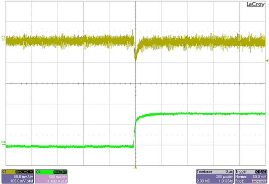 圖 2 顯示了輸出電流 700 mA 階躍變化的兩個(gè)瞬態(tài)負(fù)載響應(yīng)。左邊的線跡為連續(xù)情況,而右邊的線跡則為非連續(xù)情況。在非連續(xù)情況下,瞬態(tài)響應(yīng)比連續(xù)情況差了三倍多。同步 FET 用于強(qiáng)制連續(xù)運(yùn)行。但是,也有一些獲得較好瞬態(tài)響應(yīng)的其他方法,包括預(yù)加載輸出或者使用擺動(dòng)電感等。擺動(dòng)電感用于在低電流時(shí)增加電感。這個(gè)目標(biāo)的實(shí)現(xiàn),主要是通過兩種磁心材料:低電流飽和高鐵氧體,以及低電流不飽和粉末鐵氧體。