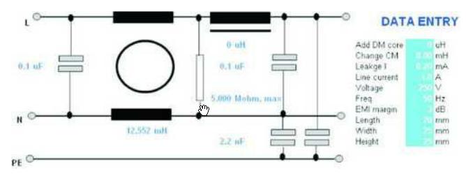 知道設備的干擾特性和輸入阻抗特性后,設計或者選擇一個濾波器就變得簡單了。如果使用一個現(xiàn)成的濾波器,可以調用過去積累的濾波器數(shù)據(jù)庫,比對濾波器參數(shù),找到一個合適的濾波器。如果沒有合適的或者想專門設計一個專用濾波器,可以借助專用的濾波器設計軟件。在確定一個濾波器模式后輸入濾波器一些簡單的約束條件,設計軟件根據(jù)阻抗特性自動計算出最合適的組件值,以及提供最合適的衰減。(如圖6所示)