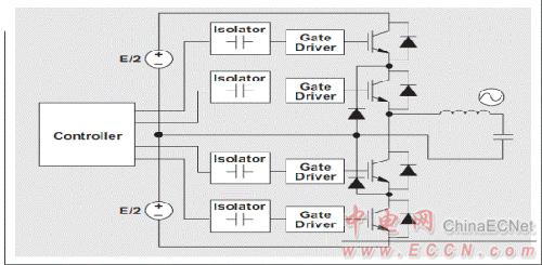 圖2表明,即使是一個(gè)單相DC到AC逆變器,也需要許多柵極驅(qū)動(dòng)器,以正確地在功率級(jí)中對(duì)IGBT進(jìn)行開(kāi)關(guān)操作。作為一種單通道柵極驅(qū)動(dòng)器,只要具有必需的信號(hào)和偏壓隔離,德州儀器UCC27531就能驅(qū)動(dòng)開(kāi)關(guān)橋的任何開(kāi)關(guān)。利用一個(gè)光耦合器或者數(shù)字隔離器,實(shí)現(xiàn)信號(hào)隔離。對(duì)于偏壓隔離,設(shè)計(jì)人員可以使用一種帶二極管和電容器的自舉電路,或者一個(gè)隔離式偏壓電源。另一種方法是,與控制器一樣,連接同一個(gè)隔離端上的柵極驅(qū)動(dòng)器,然后通過(guò)柵極驅(qū)動(dòng)器后面的一個(gè)柵極變壓器驅(qū)動(dòng)開(kāi)關(guān)。這種方法允許通過(guò)控制端上一個(gè)非隔離式電源,對(duì)驅(qū)動(dòng)器進(jìn)行偏置。