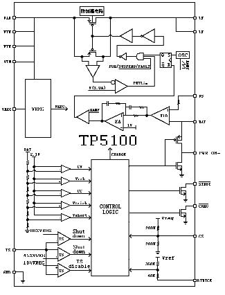 TP5100是一款開關(guān)降壓型雙節(jié)8.4V/單節(jié)4.2V鋰電池充電管理芯片。其QFN16超小型封裝與簡(jiǎn)單的外圍電路,使得TP5100非常適用于便攜式設(shè)備的大電流充電管理應(yīng)用。同時(shí),TP5100內(nèi)置輸入過流、欠壓保護(hù)、芯片過溫保護(hù)、短路保護(hù)、電池溫度監(jiān)控、電池反接保護(hù)。TP5100具有5V-18V寬輸入電壓,對(duì)電池充電分為涓流預(yù)充、恒流、恒壓三個(gè)階段,涓流預(yù)充電電流、恒流充電電流都通過外部電阻調(diào)整,最大充電電流達(dá)2A。TP5100采用頻率400kHz的開關(guān)工作模式使它可以使用較小的外圍器件,并在大電流充電中仍保持較小的發(fā)熱量。TP5100內(nèi)置功率PMOSFET、防倒灌電路,所以無需防倒灌肖特基二極管等外圍保護(hù)。