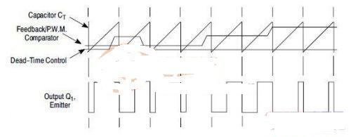 控制信號由集成電路外部輸入,一路送至死區(qū)時間比較器,一路送往誤差放大器的輸入端。死區(qū)時間比較器具有120mV的輸入補償電壓,最小輸出死區(qū)時間約等于鋸齒波周期的4%,即輸出驅(qū)動的最大占空比為96%.當把死區(qū)時間控制輸入端接上固定的電壓(范圍在0-3.3V)即能在輸出脈沖上產(chǎn)生附加的死區(qū)時間。脈沖寬度調(diào)制比較器為誤差放大器調(diào)節(jié)輸出脈寬提供了一個手段:當反饋電壓從0.5V變化到3.5V時,輸出的脈沖寬度從被死區(qū)確定的最大導通百分比時間下降到零。兩個誤差放大器具有從-0.3V到(Vcc-2.0)的共模輸入范圍,這可從電源的輸出電壓和電流察覺得到。誤差放大器的輸出端常處于高電平,它與脈沖寬度調(diào)制器的反相輸入端進行"或"運算,正是這種電路結(jié)構,放大器只需最小的輸出即可支配控制回路。