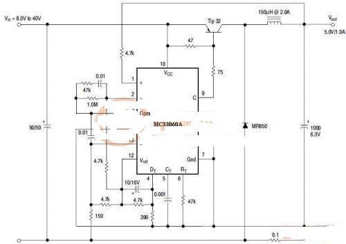MC33060作為主控芯片控制開關管的導通與截止,由其內(nèi)部結(jié)構功能可知,在MC33060內(nèi)部有一個+5V參考電壓,通常用作兩路比較器的反相參考電壓,設計中1腳和2腳的比較器用來作為輸出電壓反饋,13腳和14腳的比較器用來檢測開關管的電流是否過流。電路中2腳通過一個反相電路接參考電壓,降壓輸出反饋經(jīng)一同相電路接MC33060的1腳。當電路處于工作狀態(tài)時,1腳和2腳電壓就會相互比較,根據(jù)兩者的差值來調(diào)整輸出波形脈寬,達到控制和穩(wěn)定輸出的目的。