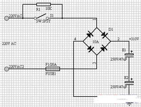 采用全橋整流電路,如下圖6 所示。輸出電流要求最大達到8A,考慮功率損耗和一定的余量,選擇10A 的方橋KBPC3510 和10A 的保險管。整流后的電壓達310V,采用兩個250V/100uF 電容作濾波處理。圖中開關S1 和電阻R1 并聯(lián)為"軟啟動"部分,此處未作詳細講解,詳細軟啟動設計見各種開關電源軟啟動設計。