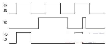 該芯片為而輸出高壓柵極驅(qū)動器,14腳雙列直插,驅(qū)動信號延時為ns 級,開關頻率可從幾十赫茲到幾百千赫茲。IR2110 具有二路輸入信號和二路輸出信號,其中二路輸出信號中的一路具有電平轉(zhuǎn)換功能,可直接驅(qū)動高壓側(cè)的功率器件。該驅(qū)動器可與主電路共地運行,且只需一路控制電源,克服了常規(guī)驅(qū)動器需要多路隔離電源的缺點,大大簡化了硬件設計。IR2110 就簡易真值圖如下圖9 所示。