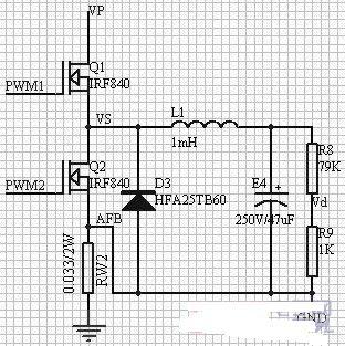根據(jù)整流后的電壓和輸入電流參數(shù),選擇IRF840 為高頻開關管,其最大耐壓VDS 為500V,最大能承受的導通電流ID 為8A,滿足設計要求。工作在高頻工作狀態(tài)的續(xù)流二極管一般選用快恢復的二極管,此處選擇HFA25TB60,能承受600V 的反向壓降,最大導通電流為25A,且恢復時間僅為35ns.輸出部分通過兩個電阻分壓至電壓采樣電路,如下圖12 所示。