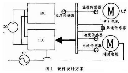 本系統(tǒng)的主要硬件模塊包括可編程控制器(PLC)、溫度傳感器、風速傳感器、速度傳感器、電流傳感器、人機界面(HMI)和電源模塊等。 PLC為本系統(tǒng)的核心控制裝置,實現(xiàn)環(huán)境溫度和電機溫度的多路檢測,風機電機轉速的檢測和牽引電機風路通風量的檢測以及輔助電機各相電流的檢測等,這些檢測到的電信號從PLC的模擬量AIO口輸入,經(jīng)PLC處理后實現(xiàn)輔助電機的控制和保護。此外,PLC數(shù)字量輸入DI口和數(shù)字量輸出口DO作為輔助電機的邏輯控制環(huán)節(jié)的輸入和輸出。溫度傳感器用來檢測環(huán)境溫度和牽引電機等的溫度,環(huán)境溫度是電機溫升的參照點,為可靠性考慮,環(huán)境溫度的檢測至少要檢測不同的3個點,因此檢測環(huán)境溫度的傳感器要有3路。電機溫度也要用溫度傳感器檢測,每1臺牽引電機溫度的檢測也要3路,檢測牽引電機不同部位的溫度。由于牽引電機溫度不能進行直接接觸檢測,所以要采用紅外線溫度傳感器。風速傳感器的作用是測量牽引電機風道的風速,從而計算出牽引電機的通風量,作為設置PID參數(shù)的重要數(shù)據(jù)。速度傳感器監(jiān)視風機電機的轉速,以判斷風機是否真正啟動以及工作是否正常。電流傳感器檢測風機電機的電流,以實現(xiàn)風機電機的過流保護。人機界面(HMI)則實現(xiàn)系統(tǒng)相應工作參數(shù)的設置,相關數(shù)據(jù)和系統(tǒng)工作狀態(tài),數(shù)據(jù)的記錄和存儲以及故障檢測和診斷信息等的顯示。PLC和HMI的通信用Modbus通信總線連接,通信協(xié)議遵循通用的標準Modbus通信協(xié)議,實現(xiàn)兩者的信息交換。硬件方案的設計如圖1所示。