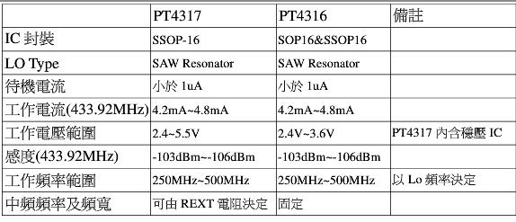 低功耗UHF OOK/ASK超外差接收器IC PT4317和PT4316的比較