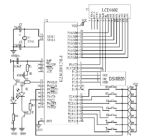 如圖2所示PIC16F873A單片機控制的遙控器發(fā)射電路設(shè)計原理圖。該電路主要以PIC50單片機為主控核心,包括行列式鍵盤電路、LCD1602液晶顯示器、DS18B20溫度才傳感器、紅外發(fā)射電路等。