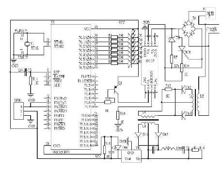 風(fēng)扇調(diào)速電路主要由橋式電路D1、光電耦合器6N137、SCR可控硅、三極管Q1等組成。PIC16F873A單片機產(chǎn)生可控硅控制的移相脈沖,通過改變相角實現(xiàn)導(dǎo)通角的改變,進90而改變輸出的電路的電壓,控制電扇的電機轉(zhuǎn)動。當(dāng)導(dǎo)通角為0時電機停轉(zhuǎn),導(dǎo)通角越大,風(fēng)扇轉(zhuǎn)速越快。P1.6為低電平時Q1導(dǎo)通,6N137光耦導(dǎo)通進而控制風(fēng)扇轉(zhuǎn)機電路。由于數(shù)字電平上下跳變時集成電路耗電發(fā)生突變,容易引起電源產(chǎn)生毛刺,通常對開關(guān)電源影響比線性電源大,因為開關(guān)電源在開關(guān)周期內(nèi)不能響應(yīng)電流突變,而僅由電容提供電流的變化部分。一般數(shù)字電路越復(fù)雜,數(shù)據(jù)速率越高,累積的電流跳變越強烈,高頻分量越豐富。采用95光耦有利于降低噪聲的干擾,提高信噪比。