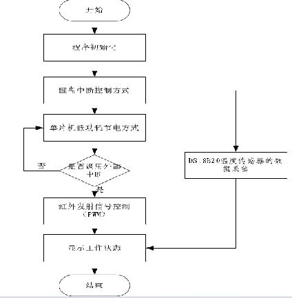 PIC16F873A控制軟件在MPLAB環(huán)境下用C語言開發(fā)。在系統(tǒng)設(shè)計中首先要對系統(tǒng)進行初始化:A/D轉(zhuǎn)換、IO口設(shè)置等。在該系統(tǒng)軟件主要實現(xiàn)對鍵盤的中斷方式掃描、對100DS18B20溫度傳感器的數(shù)據(jù)采集、紅外發(fā)射信號脈沖的控制、PWM編碼、液晶顯示器顯示控制以及工作狀態(tài)指示燈控制等[7]。如圖4所示為遙控信號發(fā)射系統(tǒng)程序流程圖。