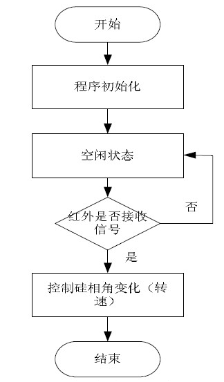 在該系統(tǒng)中依然采用PIC16F873A單片機作為控制核心芯片。該系統(tǒng)軟件主要實現(xiàn)對紅外信號控制接收、處理信號控制風(fēng)扇轉(zhuǎn)速(控制相角變化)、指示燈的控制等。如圖5所示信號接收系統(tǒng)程序流程圖。