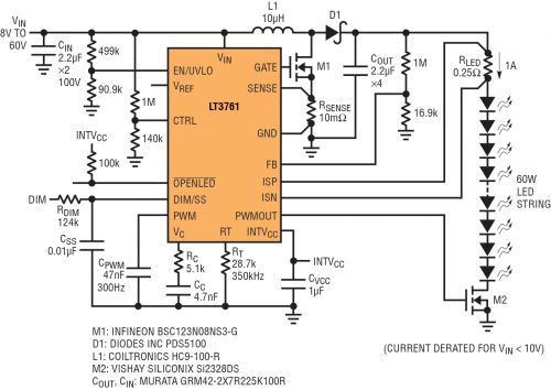 圖 1 顯示了一個(gè)效率為 94% 的高效率 60V、1A (60W) 350kHz 汽車(chē)前燈應(yīng)用,該應(yīng)用具備 PWM 調(diào)光功能。LT3761 采用與 LT3755/LT3756 系列相同的高性能 PWM 調(diào)光電路,但是增加了內(nèi)部產(chǎn)生 PWM 調(diào)光信號(hào)的功能,而且沒(méi)有增加引腳。