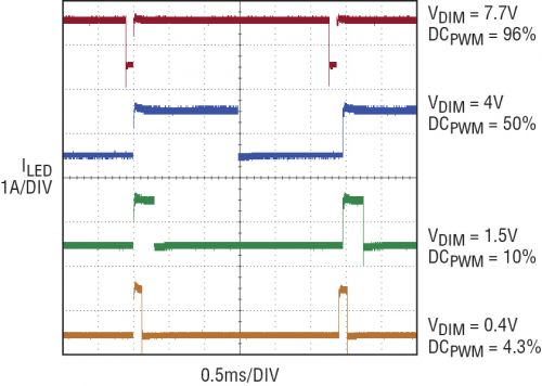 圖 2:在圖 1 所示應(yīng)用中,內(nèi)部產(chǎn)生的 PWM 信號(hào)和 LED 電流