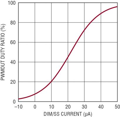 圖 3:在 DIM/SS 引腳設(shè)定占空比時(shí),采用 µA 級(jí)信號(hào)。這個(gè)引腳還可用于外部 PWM 信號(hào),以實(shí)現(xiàn)非常高的調(diào)光比