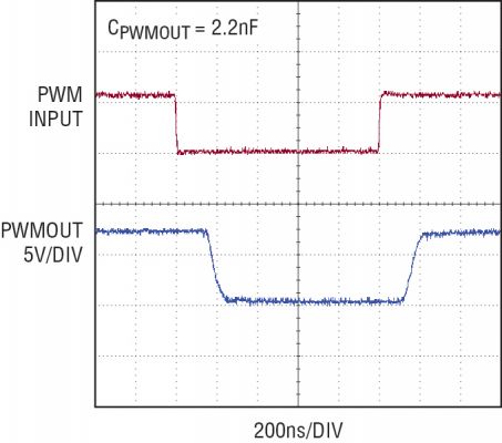 圖 4:在有高速 PWM 輸入信號(hào)的情況下,LT3761 仍然提供高速 PWMOUT 信號(hào)