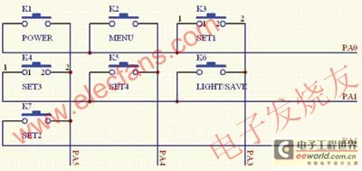 由于ST20P18的I/O口有限,故在鍵盤電路中采用掃描的方式來實(shí)現(xiàn)。該電路的實(shí)現(xiàn)方式如圖2所示。其工作的基本原理是:單片機(jī)初始化后先設(shè)置 PA0至PA5、6個(gè)I/O口均為輸入方式。以K1為研究對(duì)象,先設(shè)置PA0口為高電平,設(shè)置PA5口為低電平,當(dāng)K1按鍵按下后,PA0則由高電平跳變?yōu)榈碗娖剑a(chǎn)生中斷。單片機(jī)響應(yīng)該中斷,執(zhí)行中斷服務(wù)程序。同理,其他6個(gè)按鍵也是按照該方式工作的。單片機(jī)掃描原則是自上而下,自左而右的。