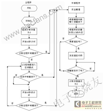 開機(jī)后,先進(jìn)行初始化,包括對(duì)單片機(jī)的初始化、LCD的初始化和其他模塊的初始化。出于省電的考慮在40s內(nèi)若沒有鍵按下,讓單片機(jī)的LCD控制器進(jìn)入空閑模式。用“for”循環(huán)來計(jì)時(shí),并設(shè)計(jì)初值為零。隨后開始40s計(jì)時(shí),若在此期間有鍵按下,則進(jìn)入中斷服務(wù)程序,若40s內(nèi)無鍵按下,則單片機(jī)的 LCD控制器進(jìn)入空閑模式。若在空閑中有鍵被按下,單片機(jī)被喚醒,執(zhí)行中斷服務(wù)程序。由于單片機(jī)的LCD控制器被中斷喚醒執(zhí)行完中斷程序返回后,單片機(jī)會(huì)接著執(zhí)行把單片機(jī)的LCD控制器置為空閑模式的那條指令的下一條指令,因此在把單片機(jī)的LCD控制器置為空閑模式的指令后再有一個(gè)循環(huán)來計(jì)時(shí),由于中斷返回前,重設(shè)計(jì)數(shù)初值為零,所以會(huì)重新開始5s的計(jì)時(shí)。在這40s內(nèi),若無鍵按下, 則單片機(jī)的LCD控制器又進(jìn)入空閑模式。程序流程圖如圖4所示。
