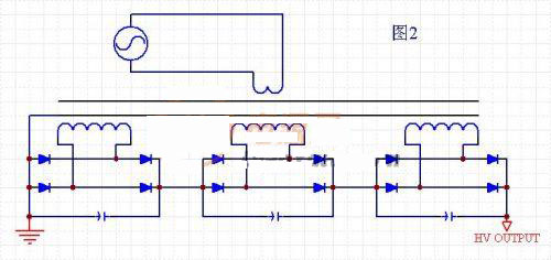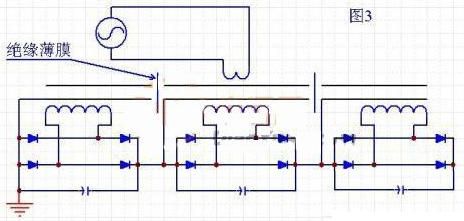 這種方式的電路示意圖如圖3所示。特點(diǎn)是,磁芯是由多段組合而成,每段磁芯之間都用絕緣性能很好的薄膜進(jìn)行絕緣。每段磁芯都有一個(gè)次級繞組。優(yōu)點(diǎn)是:適合較大功率的輸出。變壓器數(shù)量少,只需要一副磁芯。每段次級繞組與磁芯的電壓差小,次級繞組對磁芯的絕緣容易處理。缺點(diǎn)是:磁芯是分段的,結(jié)構(gòu)復(fù)雜。磁芯有氣隙,分段越多,等效氣隙越大,磁芯固定困難。